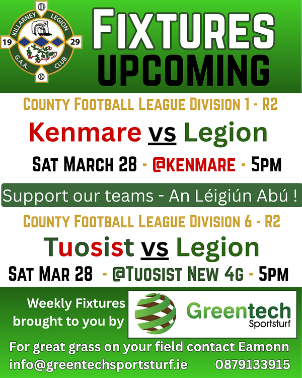 The Senior A team take on Kenmare while our Senior B team will make history as the first visitors to Tuosist's new 4G pitch. Which game will you go to?